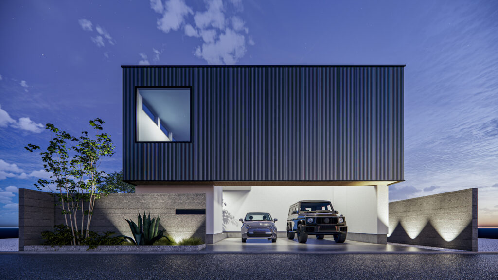吹き抜けや大開口、柱の少ないすっきりした空間、広い間口のビルトインガレージなど。