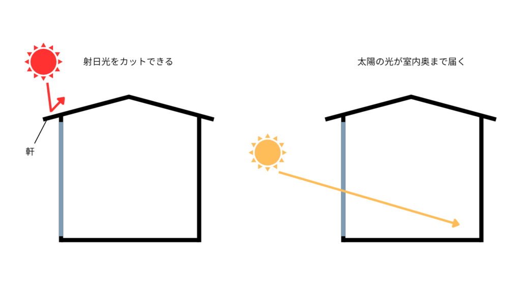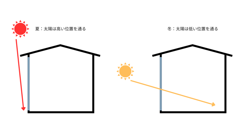 夏は太陽の位置が高いため、適切な長さの軒・庇があれば、
