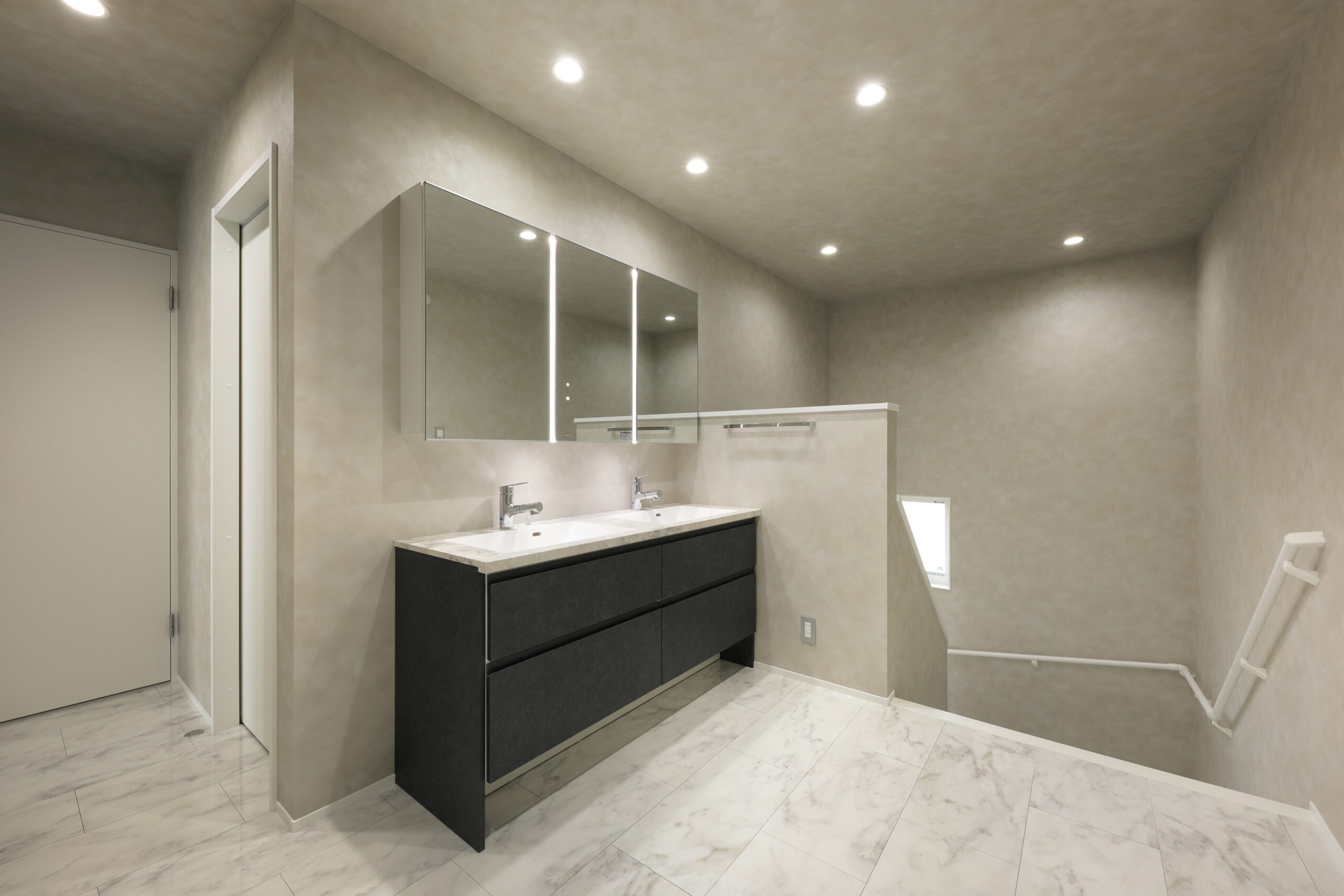 引き出し収納や扉付き収納を取り入れることで、生活感を抑えたホテルライクな洗面が実現します。